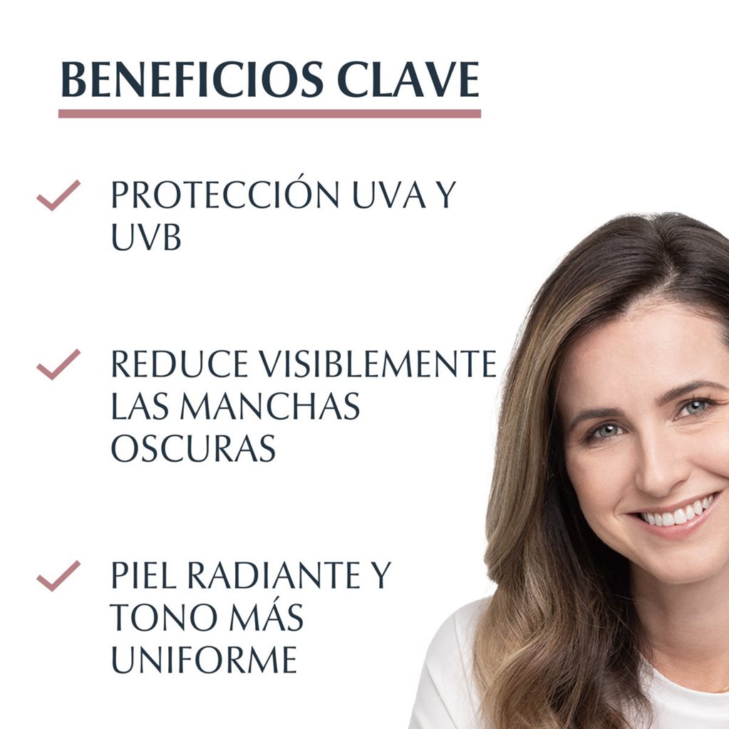 Con los filtros UVA y UVB (FPS 30), la crema hidratante de día ofrece una protección eficaz contra el sol y reduce las posibilidades de que la piel desarrolle manchas de pigmentación inducidas por el sol. La piel luce uniforme y radiante. De todas formas, es importante mencionar que Eucerin Anti-pigment Día FPS30 no es un protector solar.